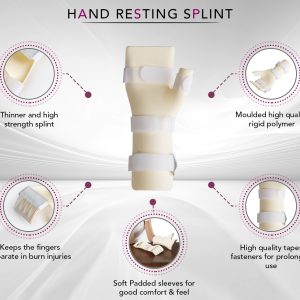 - ทำให้มืออยู่ในตำแหน่งที่สามารถใช้งานได้ในระหว่างการฟื้นฟู ช่วยรองรับมือ นิ้ว หัวแม่มือและแขนอย่างสม่ำเสมอ